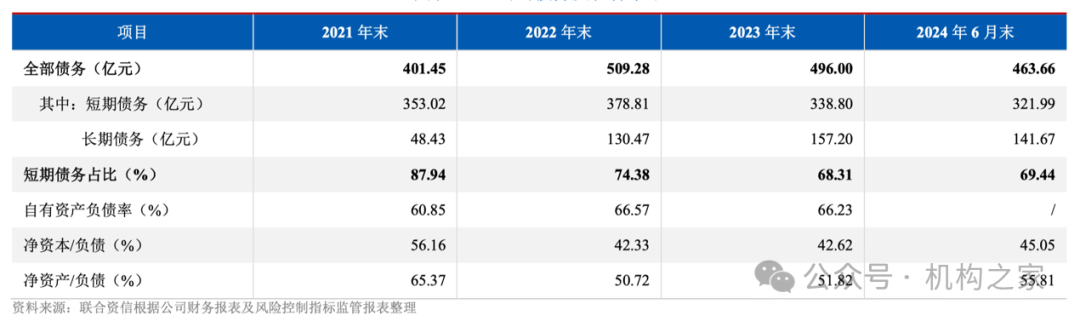蚁结伴信的信用评级论说更是揭示了西部证券短期偿付压力的严峻性。从2021年至2024年6月,公司债务规模与结构均阅历了显赫变化。2021年末,公司债务总数为401.45亿元,其中短期债务占比高达87.94%。尔后,公司通过多元化融资和主动债务处理逐步优化债务结构。2022年末,债务总数飞腾至509.28亿元,短期债务占比降至74.38%;2023年末,总债务微降至496.00亿元,短期债务占比进一步着落至68.31%。